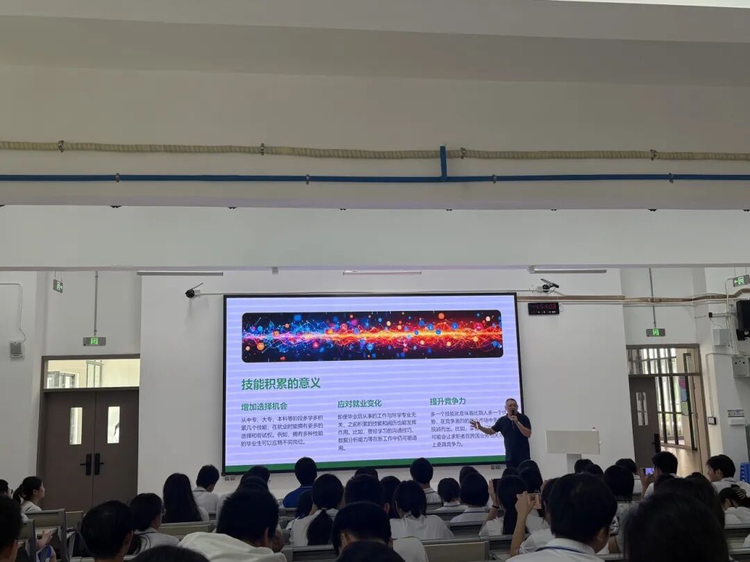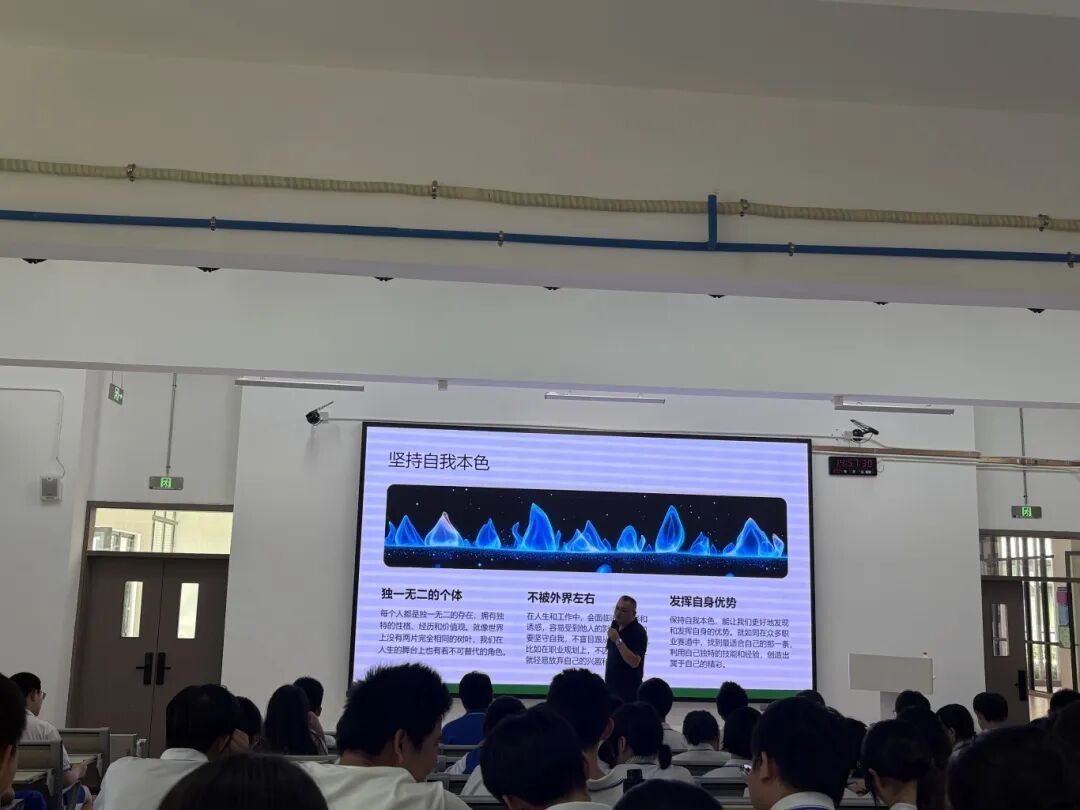 课堂中,吴先生通过详细讲解职业规划路径,强调没有唯一的成功模板,只有适合自己的道路,鼓励学生们尽早探索自我,提升就业竞争力与应变能力,即使面对不喜欢的岗位,也要认真钻研、持续提升,把每一段经历都视为成长的机遇。课程最后以“独一无二的自我”作为结语,鼓励学生在职业规划中坚持自我本色,避免盲目物质追逐,发挥自身优势,勇敢书写属于自己的精彩人生,真正实现从“生存”到“生活”再到“工作”的螺旋式成长。