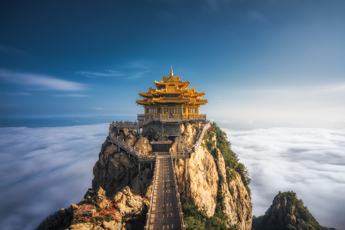 老君山:云海中的道教仙山 雪后的老君山,是现实版《千里江山图》。玉树琼枝裹着晶莹雾凇,金顶道观群在云海中若隐若现,红绸与白雪相映,尽显千年道韵。登顶伏牛山主峰,看雪浪漫过八百里秦岭,日出时分霞光浸染雪峰,每一帧都自带仙气滤镜,堪称国风赏雪天花板。